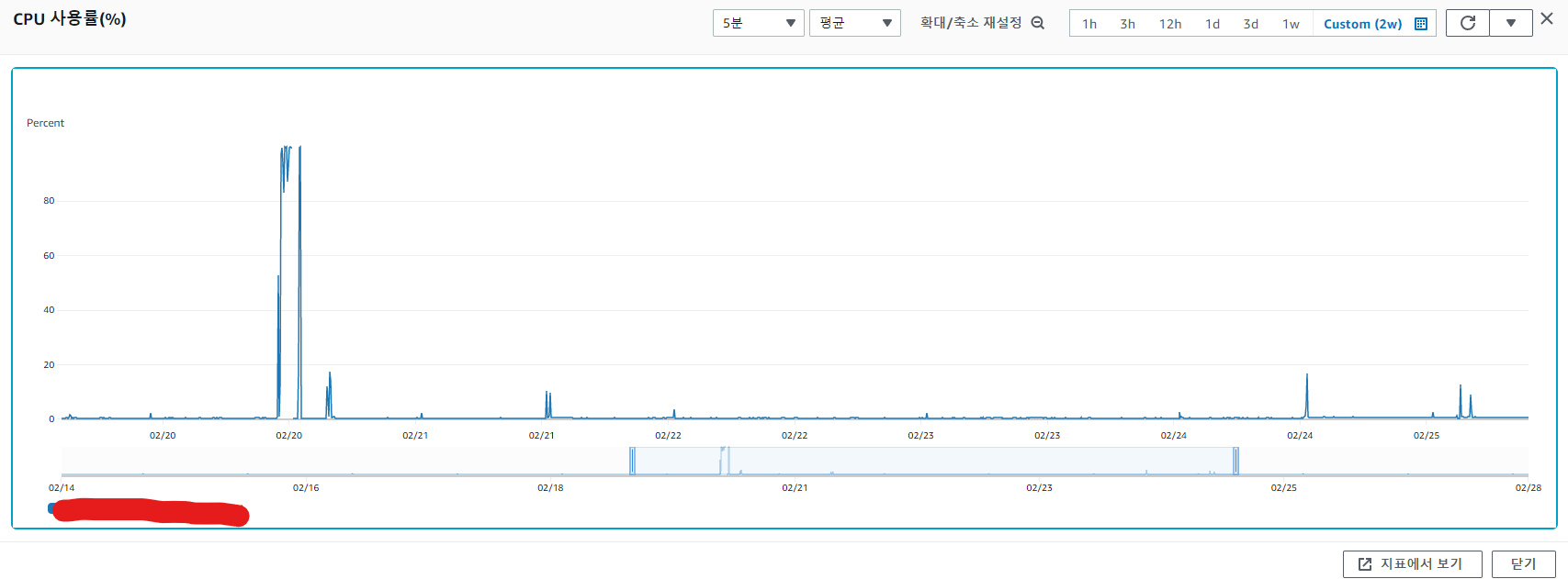 아래 사진에 보면 20일에 cpu 사용량이 최대로 오르면서 AWS EC2에 접속중이던 내 터미널이 아무 반응이 일어나지 않는 상태가 됐었다.