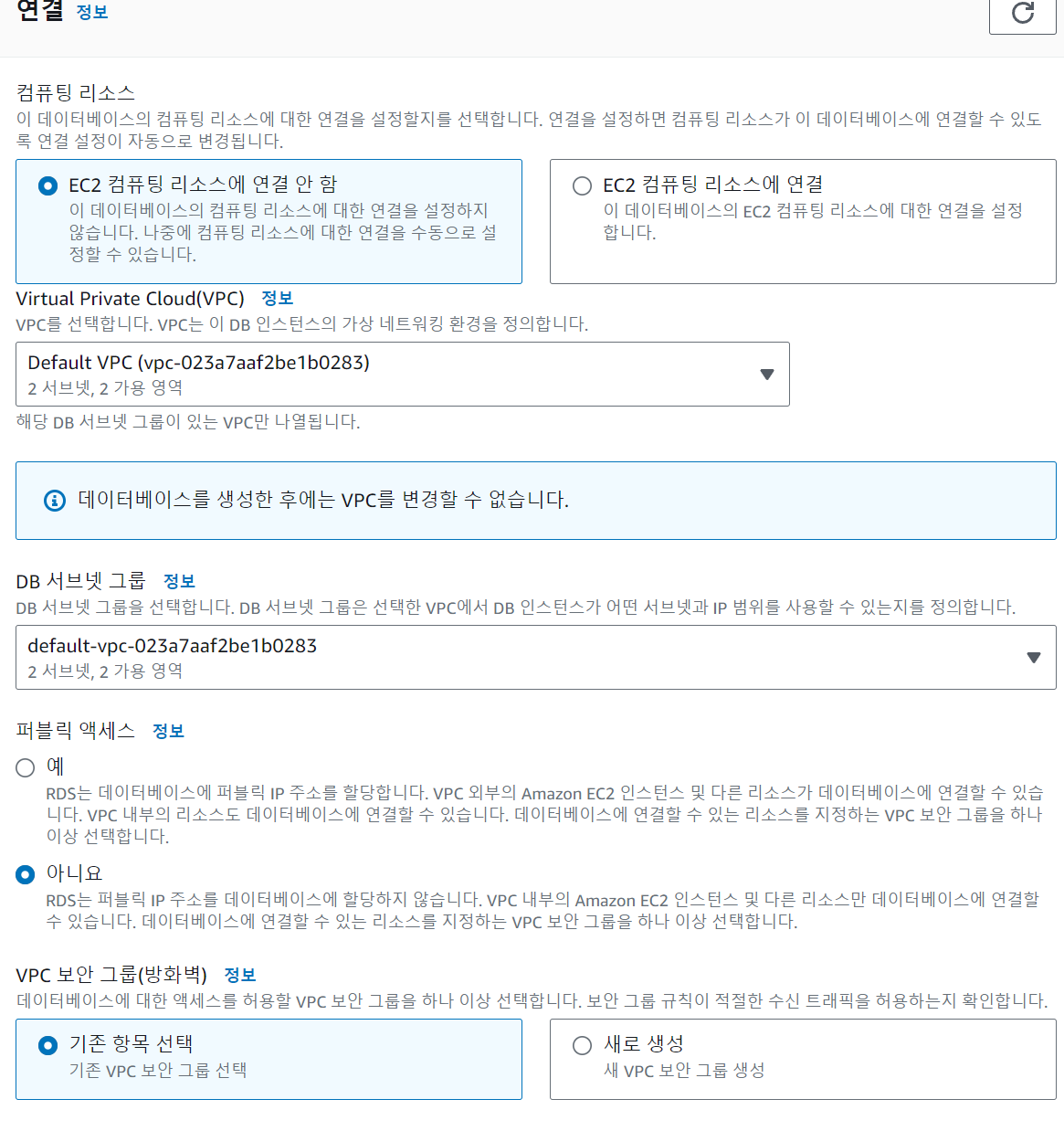 실제 product 라면 vpc 안에서 ec2 - rds 간에 연결만을 뚫어놓고 외부를 차단해서 안전하게 사용하겠지만 지금은 스터디 단계이기에 굳이 그렇게까진 하지 않으려고 ec2 연결 안했으며 퍼블릭 액세스를 열어두었다.
